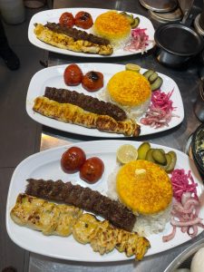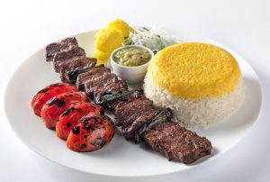 یک سیخ جوجه زعفرانی 250 گرمی / یک سیخ کباب کوبیده 150 گرمی به همراه برنج محلی و دورچین