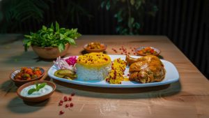400 گرم جوجه با استخوان مرینیت شده به همراه برنج محلی و دورچین